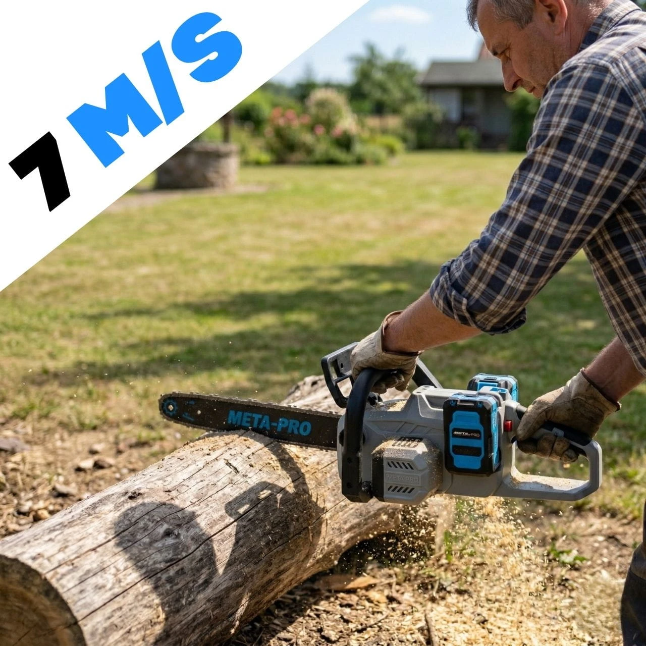 To nie jest mała piła do gałęzi! Prowadnica o długości 16 cali (ok. 40 cm) pozwala na ścinanie średnich drzew i swobodne cięcie grubych pni na klocki opałowe. Łańcuch rozpędza się do prędkości 7 m/s, co zapewnia błyskawiczne "wgryzanie się" w drewno i gładki, czysty rzaz bez szarpania materiału.