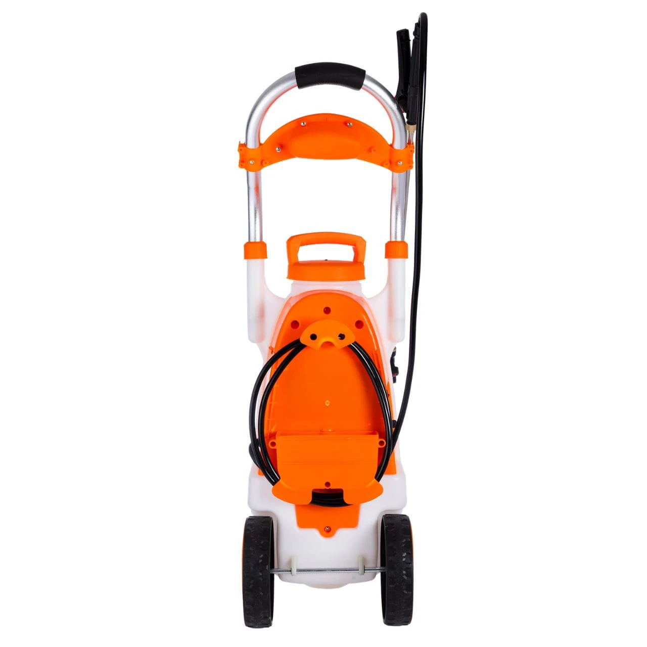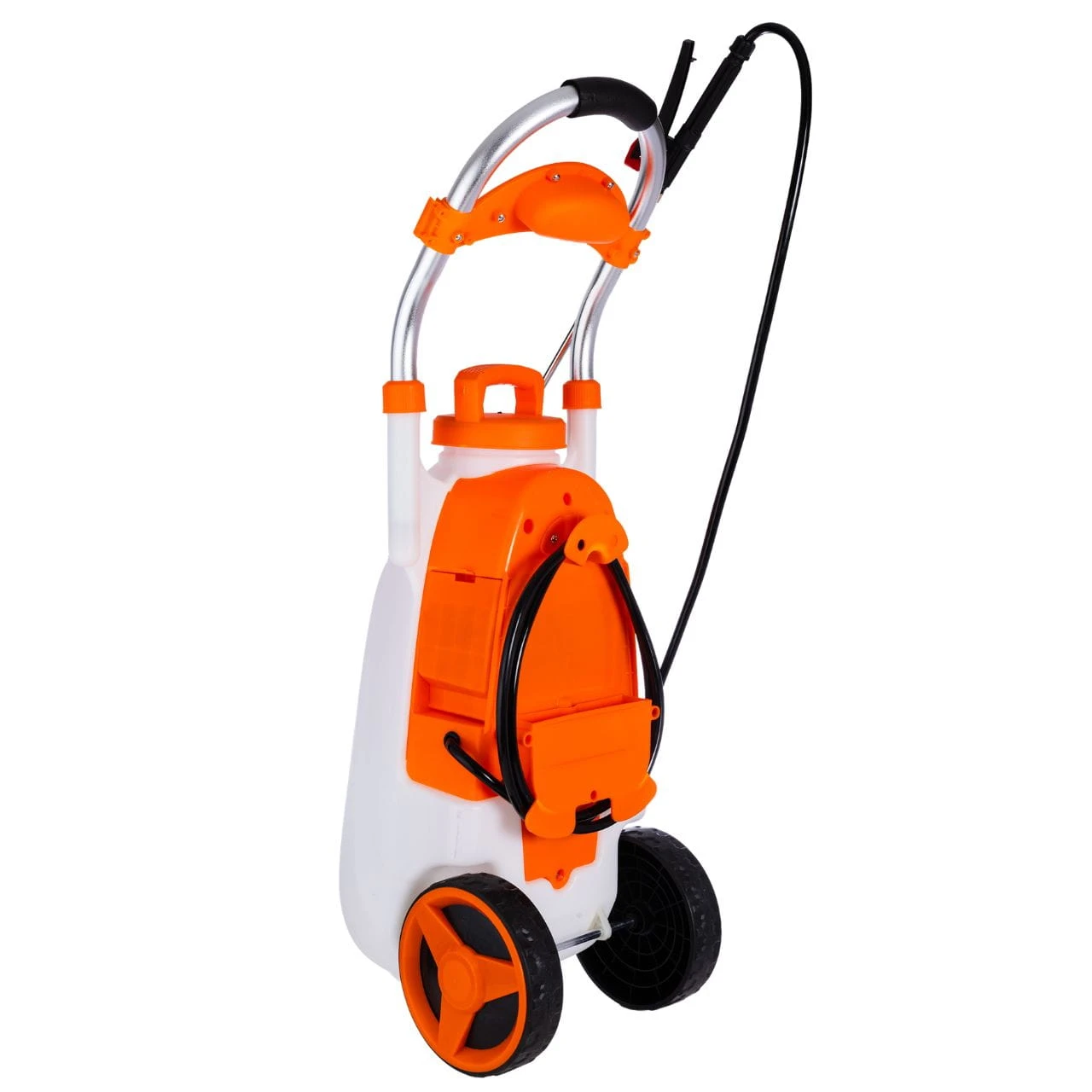 Napełniony opryskiwacz potrafi sporo ważyć. Dlatego ten model został wyposażony w duże, solidne koła oraz aluminiowy uchwyt transportowy. Dzięki temu przemieszczanie się z urządzeniem po trawniku, ścieżkach czy alejkach w szklarni jest niezwykle lekkie i nie obciąża kręgosłupa.