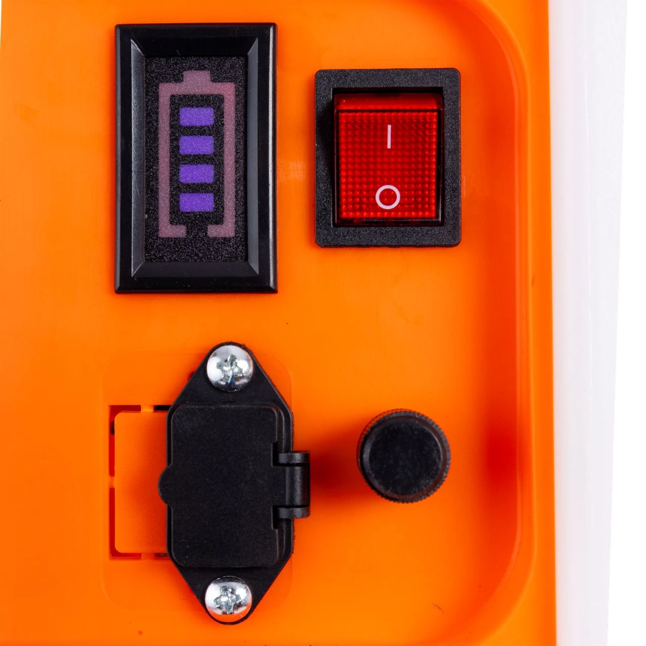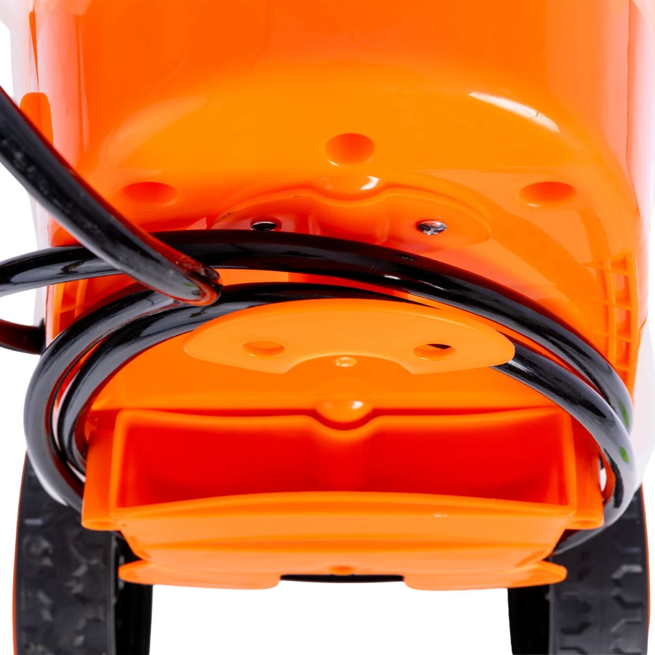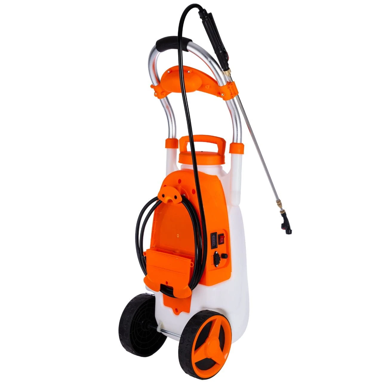 Aby praca była jeszcze wygodniejsza, w zestawie znajduje się elastyczny wąż o długości aż 3 metrów. Możesz postawić wózek w jednym miejscu i swobodnie opryskiwać duży obszar dookoła. Na boku urządzenia znajduje się intuicyjny panel sterowania wyposażony we włącznik, potencjometr do płynnej regulacji ciśnienia oraz woltomierz LED, który na bieżąco wskazuje stan naładowania baterii.