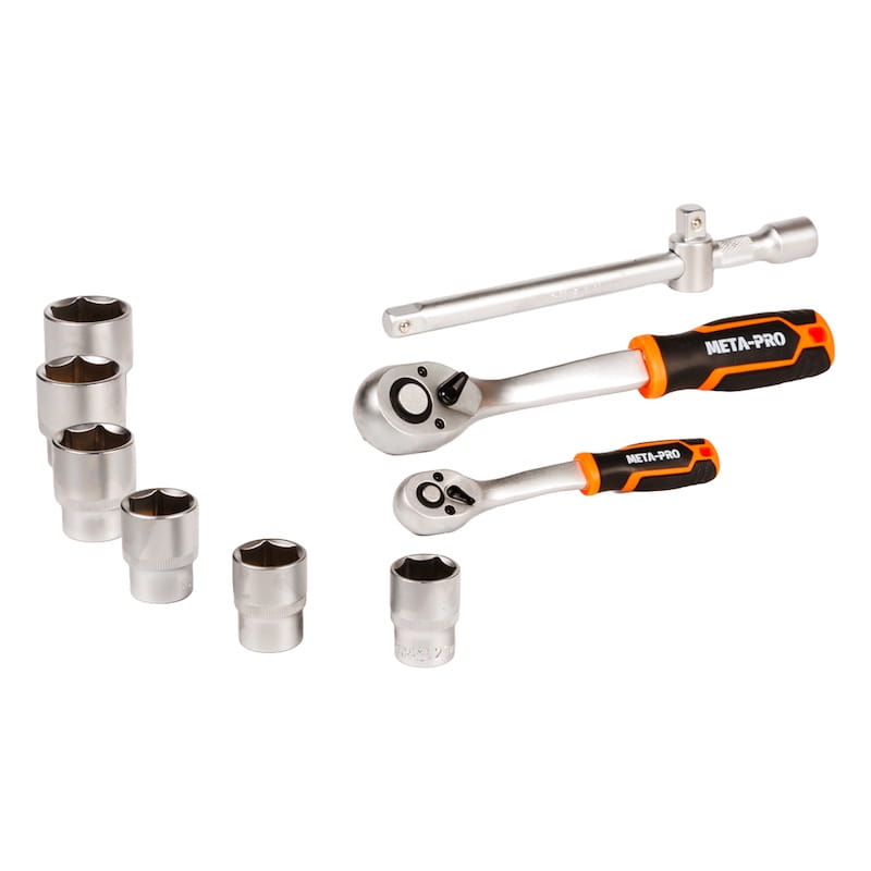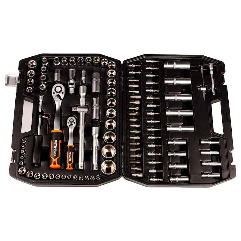 System 1/2": Grzechotka, 17x nasadki krótkie, 5x nasadki długie, 8x Torx-E, 2x nasadki do świec, przedłużki, przegub, adaptery.