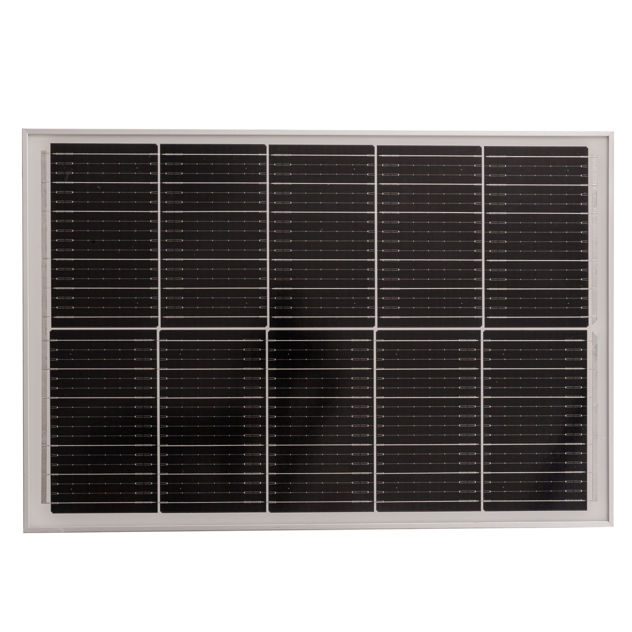 Panel solarny 50 W / 6 V – większy rozmiar: 670 × 450 × 17 mm, z regulacją kąta dla maksymalnego nasłonecznienia.